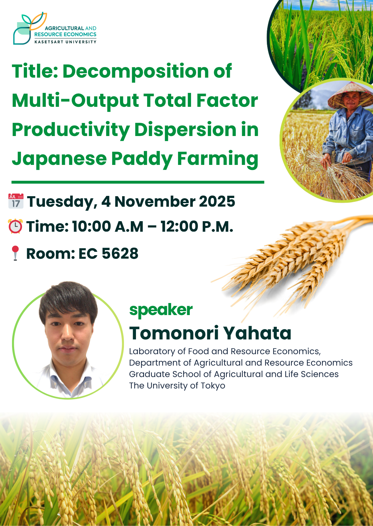 Title: Decomposition of Multi-Output Total Factor Productivity Dispersion in Japanese Paddy Farming speaker : Tomonori Yahata Laboratory of Food and Resource Economics, Department of Agricultural and Resource Economics, Graduate School of Agricultural and Life Sciences, The University of Tokyo 📅...
