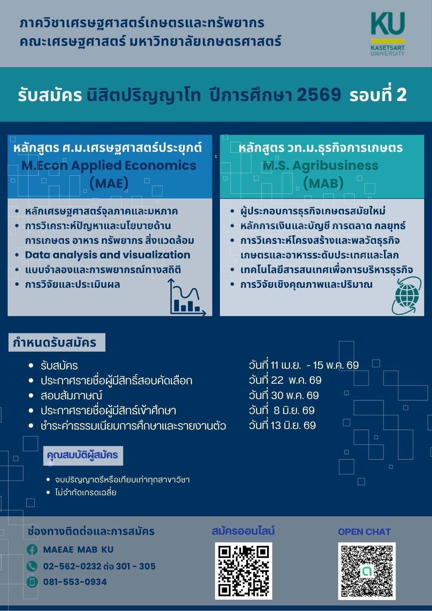 ประชาสัมพันธ์: เปิดรับสมัครนิสิต ปริญญาโท ปีการศึกษา 2569 หลักสูตรเศรษฐศาสตรมหาบัณฑิต สาขาวิชาเศรษฐศาสตร์ประยุกต์ (MAE) รหัสสาขา XG71 กำหนดการรับสมัคร: รับสมัคร: ตั้งแต่บัดนี้ ถึงวันที่ 10 เมษายน 2569 สอบสัมภาษณ์: วันที่ 9 พฤษภาคม 2569 ประกาศรายชื่อผู้มีสิทธิ์เขาศึกษา: วันที่ 1 มิถุนายน 2569 รายง...