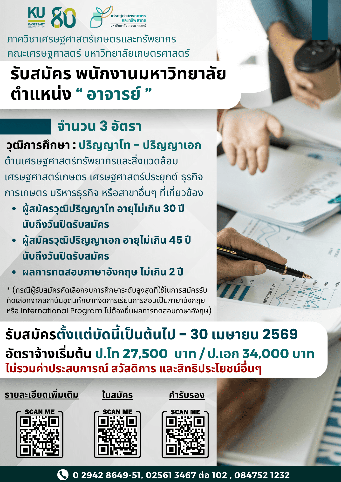 ภาควิชาเศรษฐศาสตร์เกษตรและทรัพยากร คณะเศรษฐศาสตร์ มหาวิทยาลัยเกษตรศาสตร์ รับสมัครพนักงานมหาวิทยาลัยตำแหน่ง “ อาจารย์ ” จำนวน 3 อัตรา วุฒิการศึกษา : ปริญญาโท – ปริญญาเอก ด้านเศรษฐศาสตร์ทรัพยากรและสิ่งแวดล้อม เศรษฐศาสตร์เกษตร เศรษฐศาสตร์ประยุกต์ ธุรกิจการเกษตร บริหารธุรกิจ หรือสาขาอื่นๆ ที่เกี่ยวข...