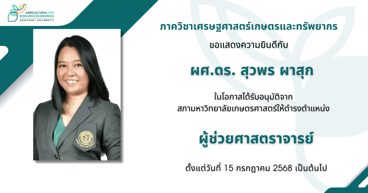 คณาจารย์และเจ้าหน้าที่ภาควิชาเศรษฐศาสตร์เกษตรและทรัพยากร ได้ร่วมงานเลี้ยงและแสดงความยินดี รศ.ดร. อุชุก ด้วงบุตรศรี และ ผศ.ดร. สุวพร ผาสุก