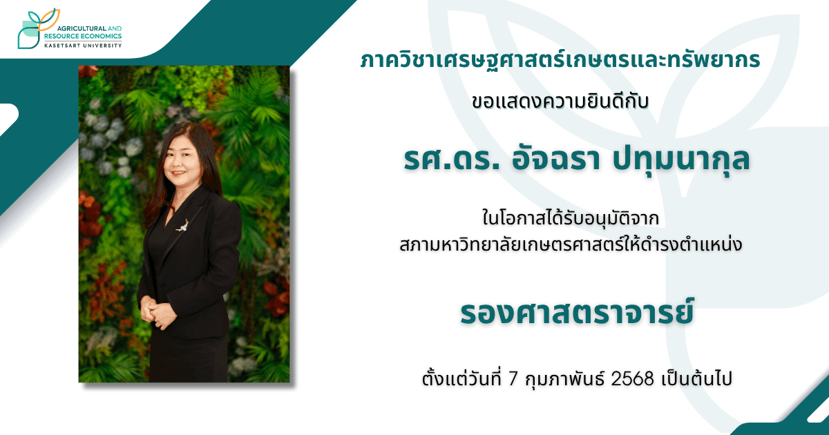 ภาควิชาเศรษฐศาสตร์เกษตรและทรัพยากร ขอแสดงความยินดีกับ รศ.ดร. อัจฉรา ปทุมนากุล ในโอกาสได้รับอนุมัติจากสภามหาวิทยาลัยเกษตรศาสตร์ให้ดำรงตำแหน่งรองศาสตราจารย์