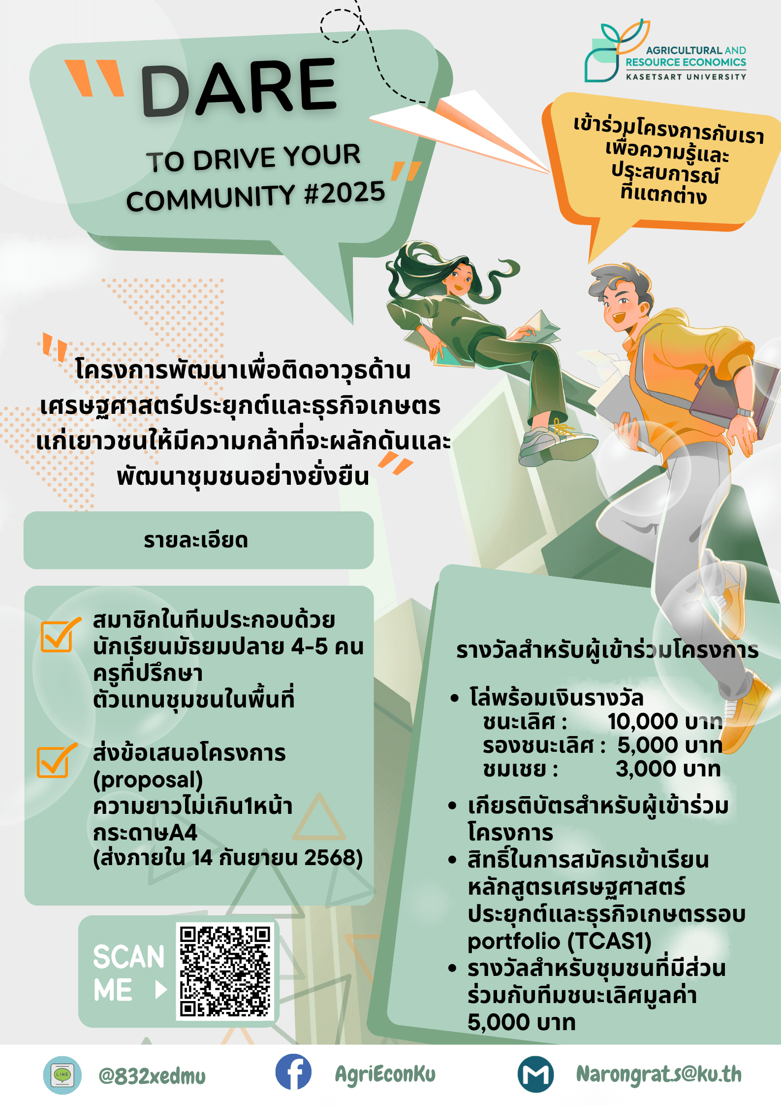 ได้เวลาน้องๆ นักเรียนระดับมัธยมปลาย ได้โชว์ของกันอีกครั้ง กับ ”โครงการ DARE TO DRIVE YOUR COMMUNITY “ โครงการพัฒนาเพื่อติดอาวุธ ด้านเศรษฐศาสตร์ประยุกต์และธุรกิจเกษตร แก่เยาวชนให้มีความกล้าที่จะผลักดัน และพัฒนาชุมชนอย่างยั่งยืน”ปีที่ 4 สมัครเข้าร่วมโครงการฯ กันได้แล้วรับรองน้องๆ นักเรียนได้ทั้งควา...